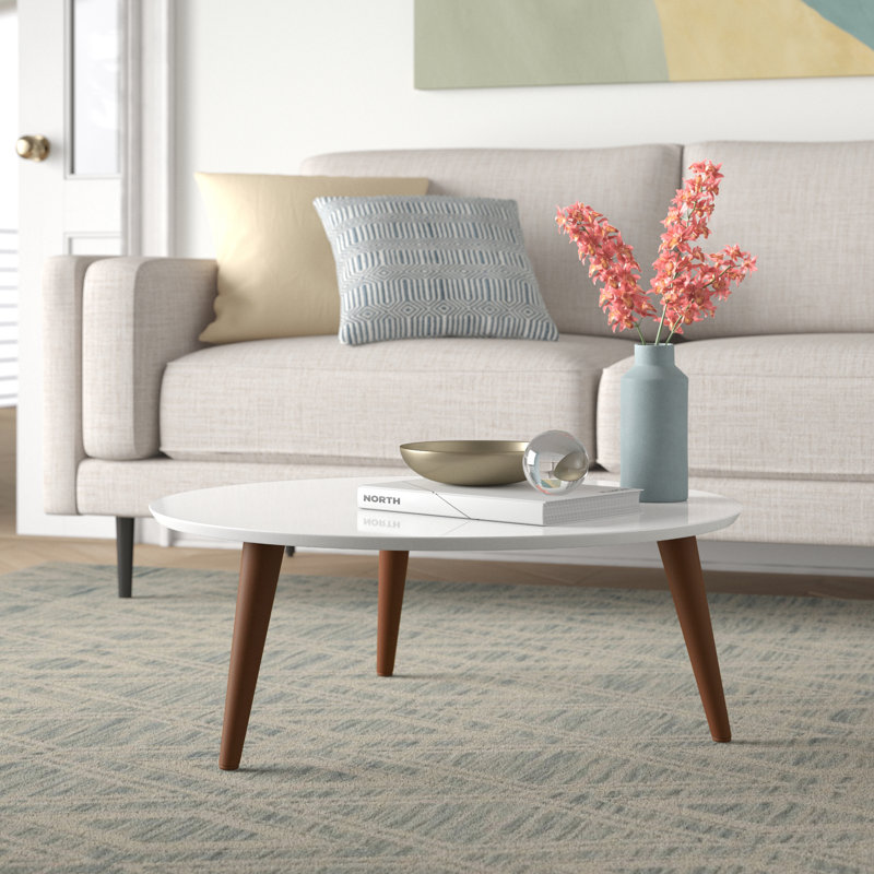 This coffee table brings a streamlined silhouette to center stage. It has a solid wood base in a natural brown finish and an engineered wood top in a neutral hue. This table features a minimalist circular top and stands on three splayed legs for a mid-century modern feel. Clean-lined and sleek, it complements nearly any modern or contemporary decor. Place it in front of your sofa or loveseat, and use it to rest beverages, display items, and coffee table books. Then, sit back as it ties your living space together.