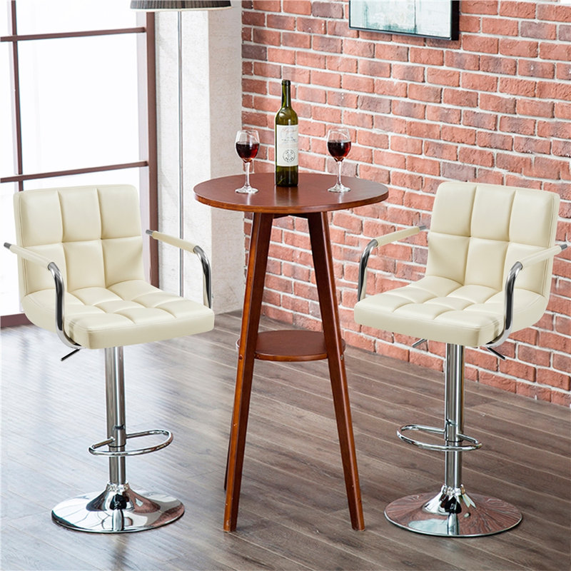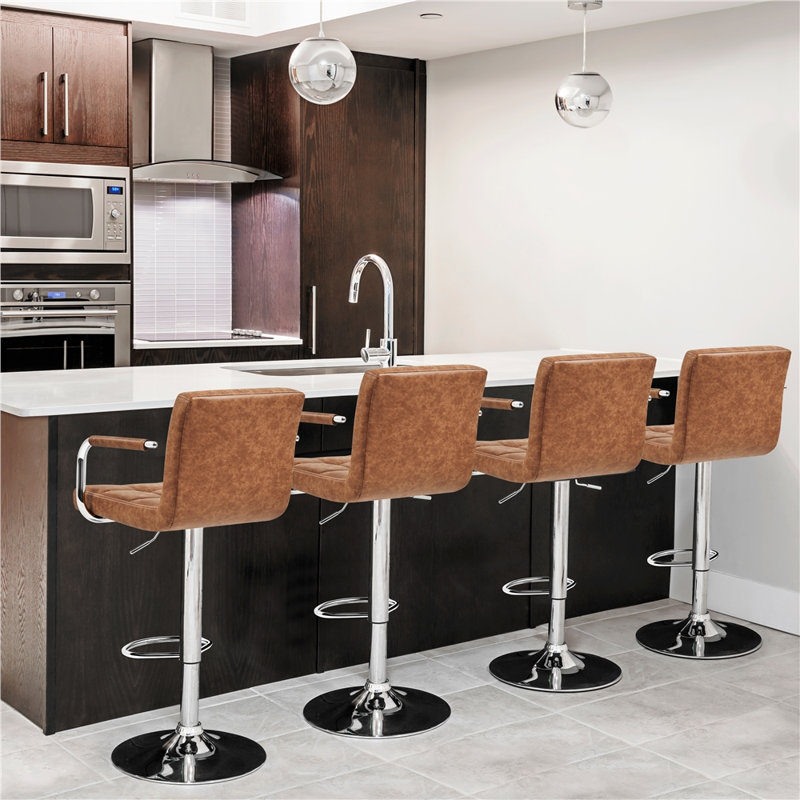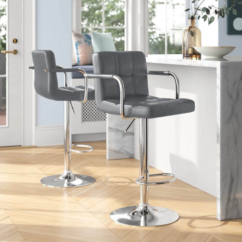 Enjoy cocktails at your home bar or Sunday brunches at the kitchen island with this 2-piece bar stool set. Each modern piece features a sleek pedestal base and a thin frame made from steel with a shiny chrome finish. The low back and square seat are upholstered in faux leather with a tufted design, and filled with foam for cushioned support. An adjustable height feature, fixed arms, and a footrest keep you comfortable while you sit. Plus, these stools have a 360-swivel feature that easily lets you move from one conversation to the next. These stools accommodate up to 300 lbs.