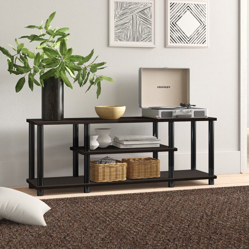 Bring a streamlined style to your living room or den with this stand. this features three tiers of shelving on sleek PVC posts. The shelves easily accommodate your cable box, entertainment console, and A/V accessories, while their open backs are great for running cables through.