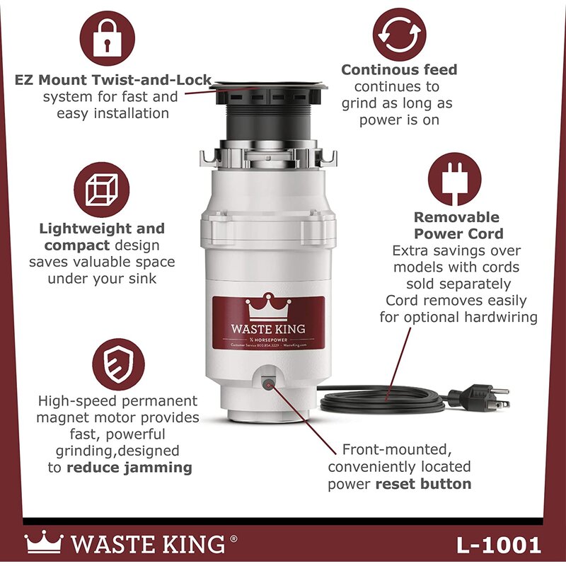The Waste King 1001 Legend Series 1/2-HP EZ-Mount Compact Garbage Disposer is one of the best food disposers on the market. With a high-speed 2600 r.p.m. Vortex powered permanent magnet motor, this disposer can efficiently get rid of your food waste. It includes a removable splash guard that aids in internal inspection and can be easily cleaned. It is also septic safe for properly sized septic tanks, making it environmentally friendly. The fast and easy mount system provides a no-hassle installation and is suitable for dishwasher hookup.