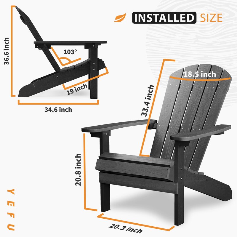 Sedentary not tired, enjoy yourself on the patio or deck on a cozy afternoon: An Adirondack chair is designed ergonomically. The curved and lengthened chair back effectively releases spinal pressure and relieves fatigue. 103°elevation allows sitting design deeper, which is easily fit for adults, and tall and obese people More comfortably when sitting. The armrests are wide enough to place commonly used style cups and plates.