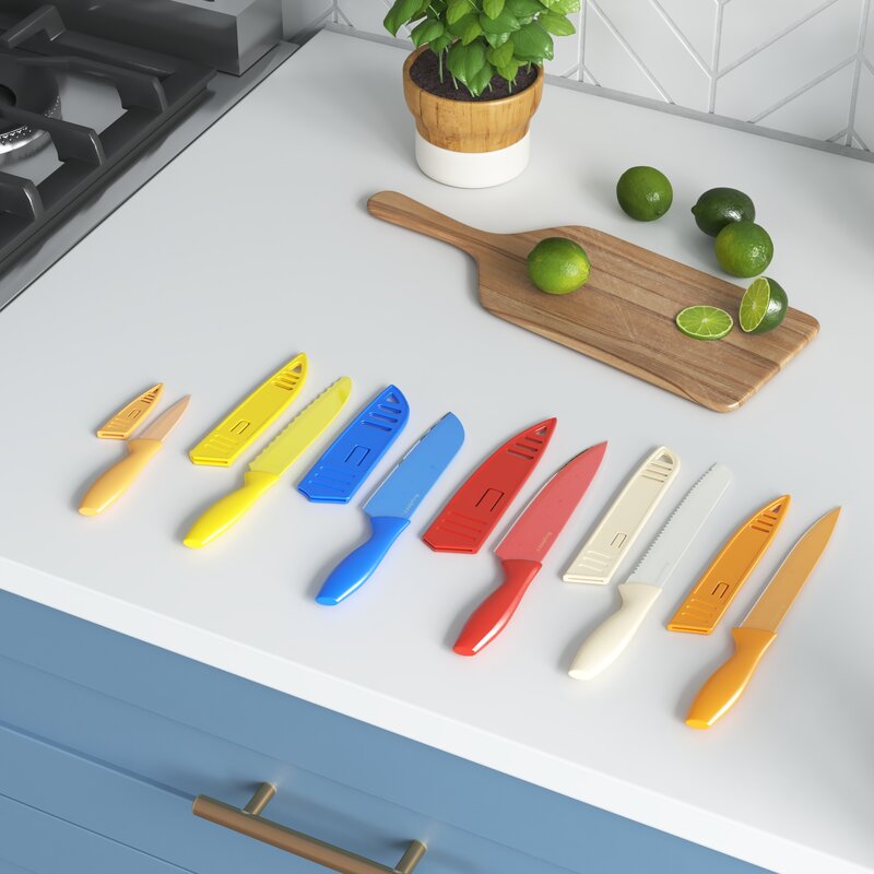 Absolutely love this knife set. So many knives for such an amazing price. Knives come with protective guards which is great since I keep mine in a drawer. Super sharp as well. Love the color coding so when digging threw the drawer I know what color to pull to get my cutting done!