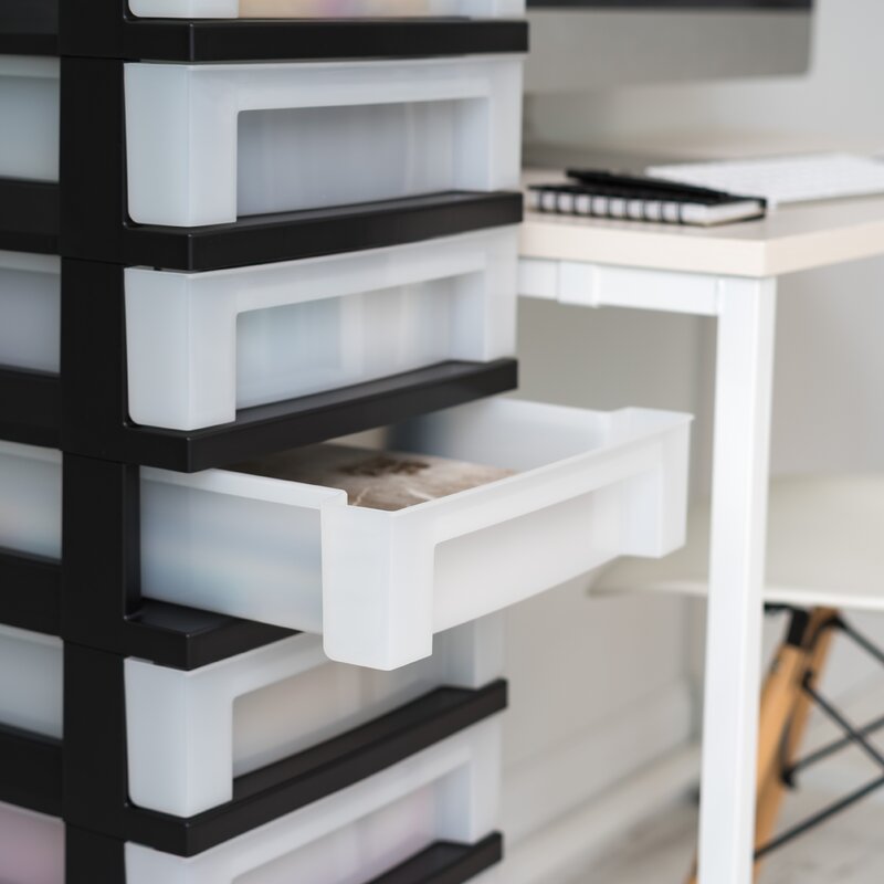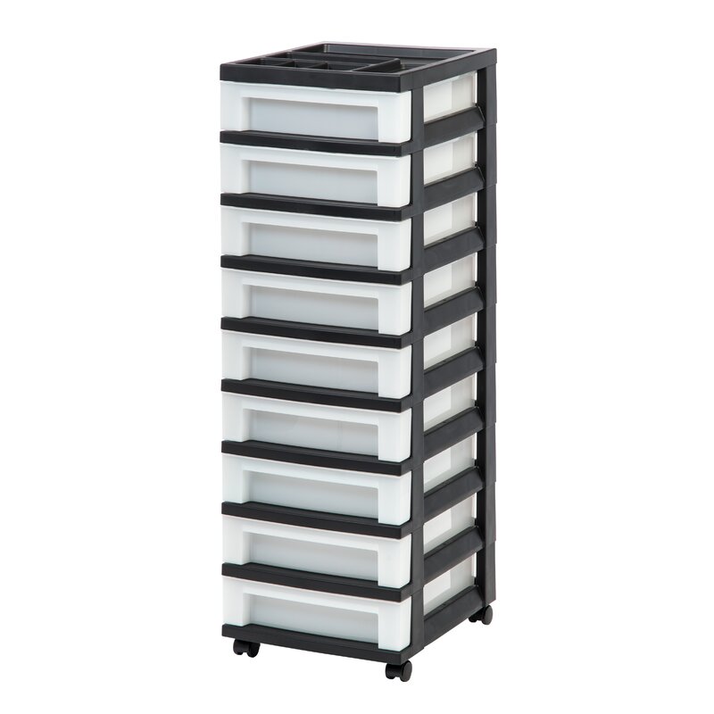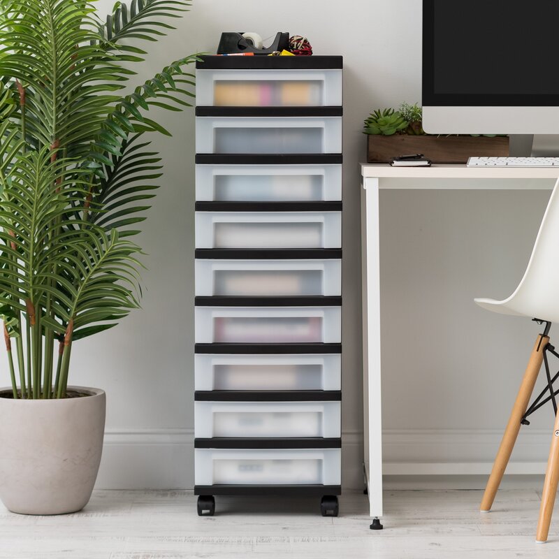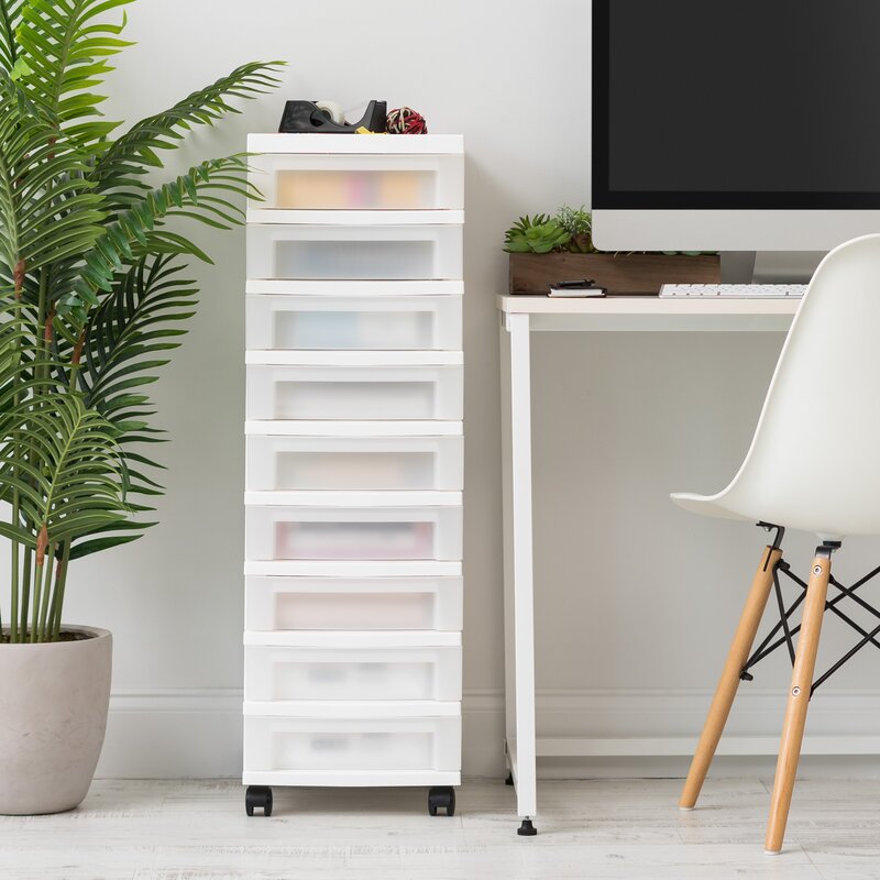 Is your office, craft room, laundry, or closet over the top with messy clutter? This vertically-oriented storage solution, with its nine roomy drawers, is to the rescue! Entirely made from durable plastic, it has a frame that sits on smooth-glide casters for easy mobility over most surfaces. The nine semi-translucent drawers make organizing everything from reams of printer paper and hobby supplies to cleaning products and cosmetics a breeze. What’s more, they have built-in drawer stops but are also removable for accessibility. Tool-free assembly is required.