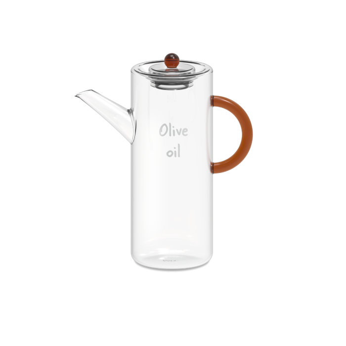 Borosilicate glass oil bottle with brown handle and decorating quote (“Olive oil”). The modern shape gives this oil bottle an original and unique look.