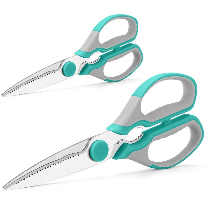 Every kitchen needs 2 pairs of kitchen shears — one reserved for food use, and one for packages/cardboard/paper and other non-food tasks. I like to use my food shears for so many things — grape clusters, snipping herbs right onto a salad or into a dish, cutting the fat off chicken pieces, cutting pizza (try it!), snipping bread dough…so many useful tasks. And the other pair, for opening packages, cutting cardboard, paper, string and other things, gets used multiple times a day as well. I was happy these came 2 to a pack and in a variety of colors, so I could chose a bright color that I can see easily when I open the kitchen drawer. They’re light but sturdy, and you see that little ridged area? You can use it to open sticky jar lids. This will make a nice gift for someone who moved into their first apartment (don’t tell my son he is getting these for Christmas!), or gift yourself and make your kitchen life easier.Highly recommend!