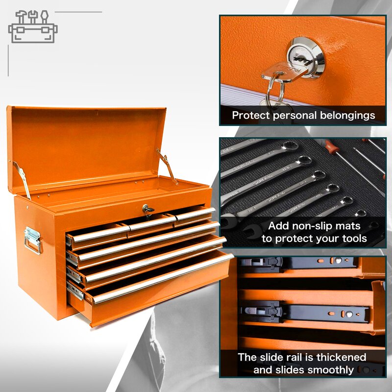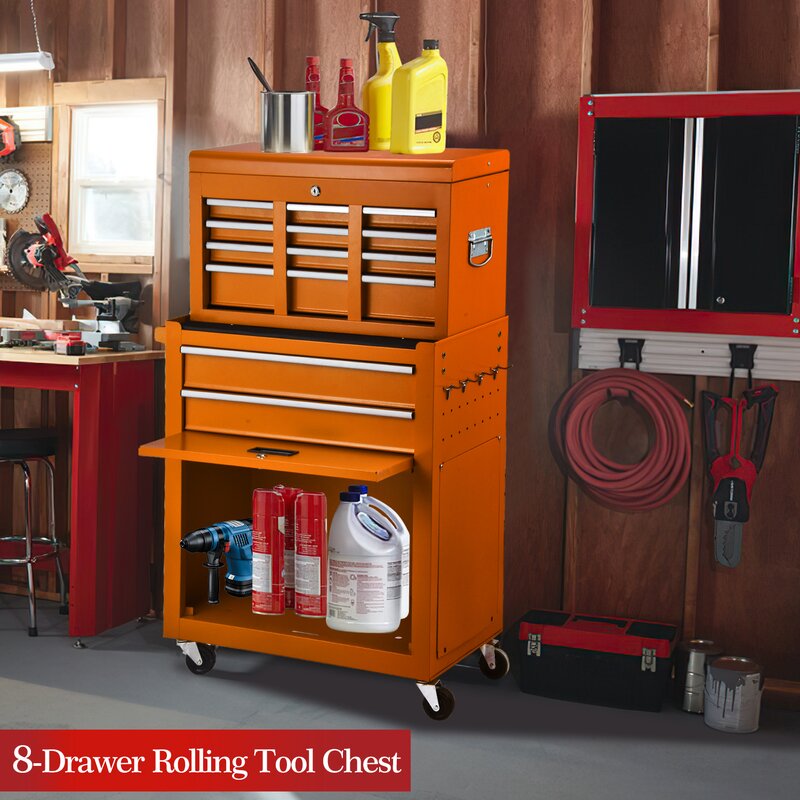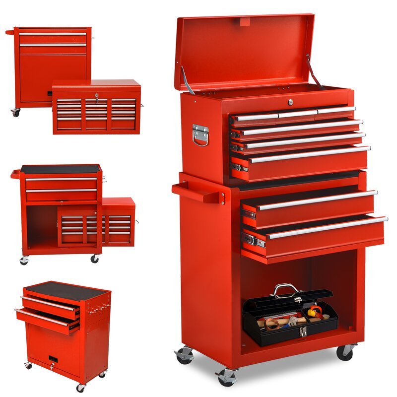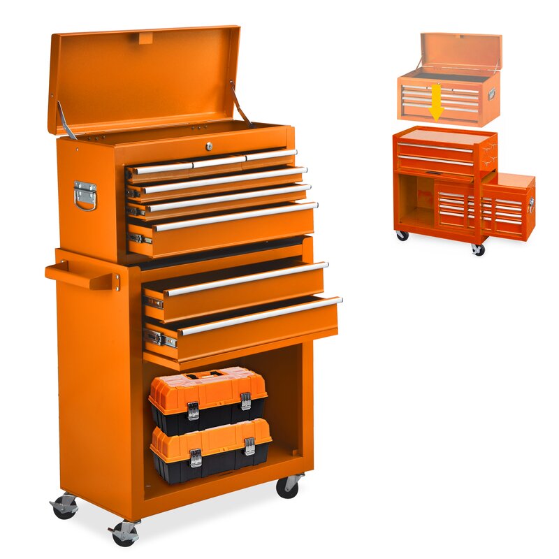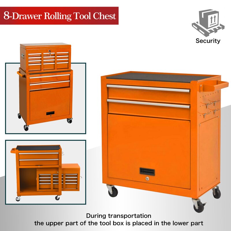 The 8-drawer tool chest consists of a removable top cabinet and a movable bottom cabinet. The top box contains 6 drawers, and the bottom box contains 2 drawers and a box. It is very suitable for both home and work. It has a large capacity, easy classification, and easy access to tools. It is an indispensable treasure in life. Features: Large capacity can accommodate a variety of tools. Tools can be reasonably stored and easy to take. A strong material, more durable than an ordinary toolbox. Anti-rust and anti-corrosion, no need to worry about any problems during use. Flexible movement and sensitive braking. Add non-slip mats to better protect your tools. The tool cabinet contains two locks to protect your personal belongings. One thing for two purposes can be disassembled or combined to use according to your mood. Specification: Material: cold-rolled steel. Top tool chest dimension: 23.6″ × 10″ × 15.2″ (L×W×H). Bottom tool chest dimension: 24.4″ × 13″ × 29.3″ (L×W×H). Total weight capacity:63 lbs. Assembly problem: You will receive a detailed installation manual, trust me, you will complete it easily. To facilitate transportation, we will stuff the top cabinet directly into the bottom cabinet. I sincerely hope you have a pleasant shopping experience.