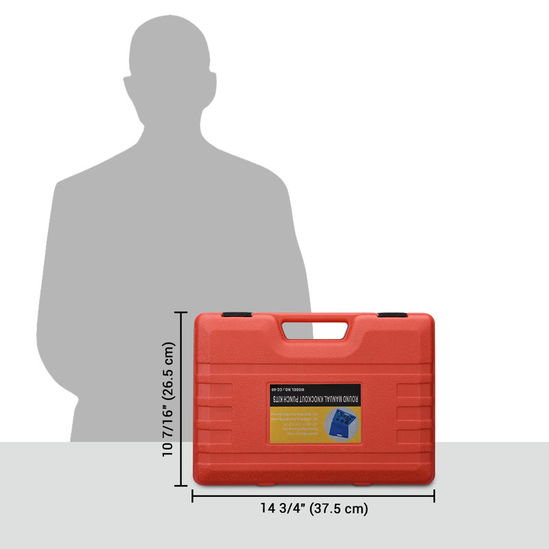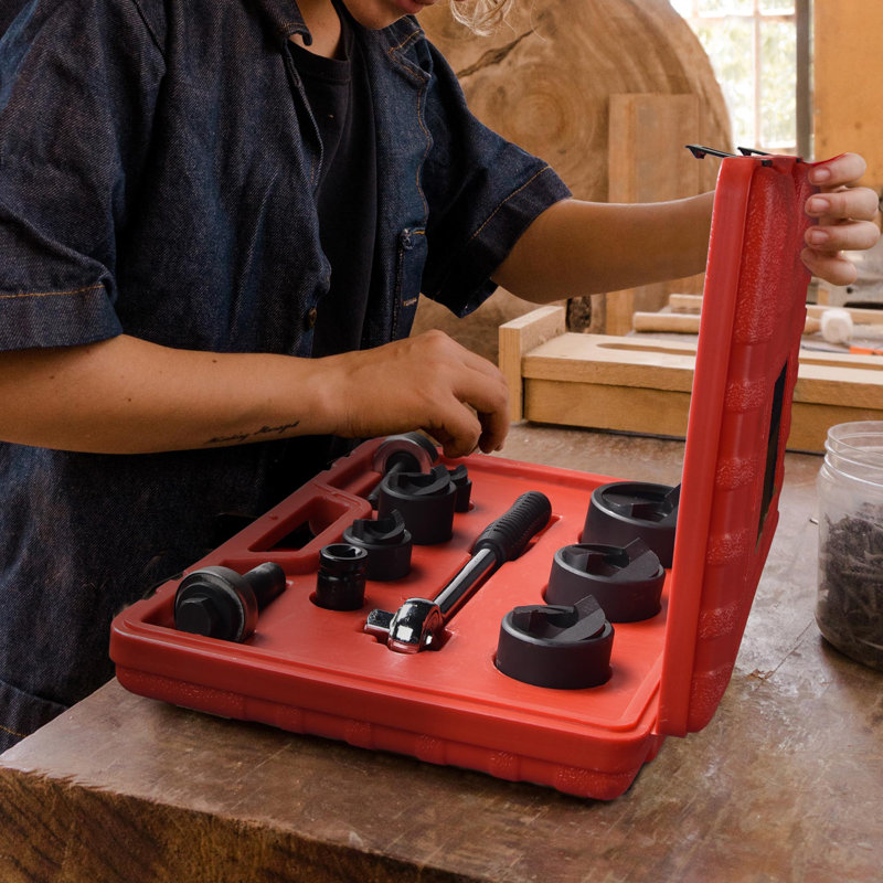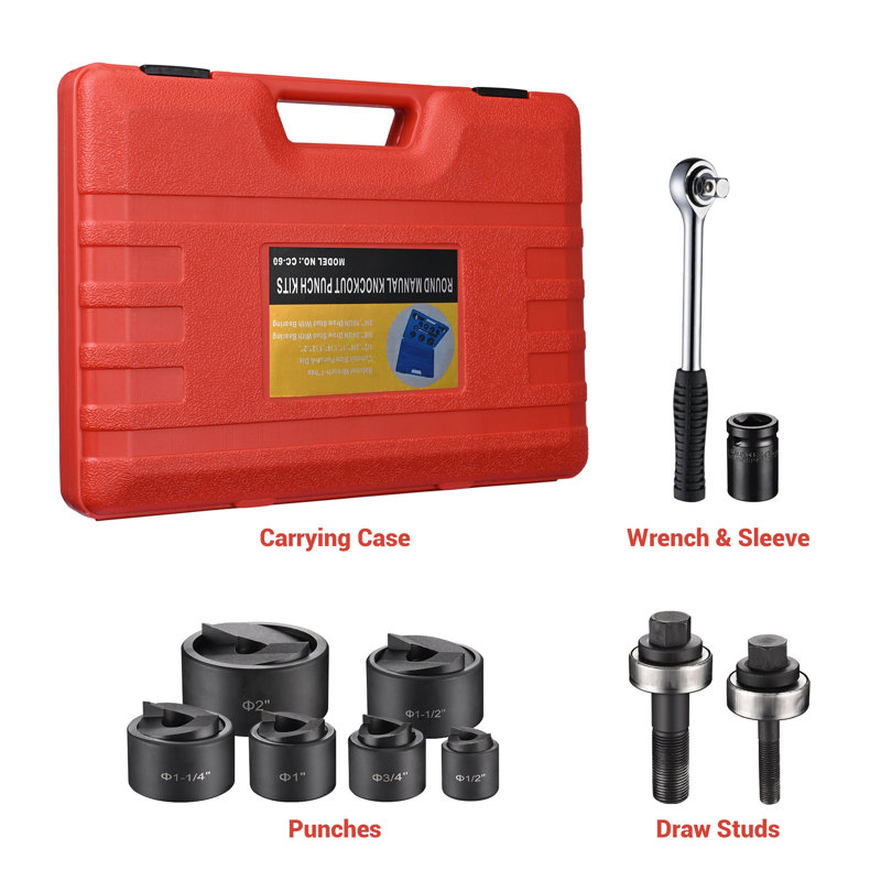 The 6-ton manual knockout hole punch driver kit consists of 1 wrench, 1 sleeve, 2 draw studs, 6 punches & 1 carrying case. With 6 punch sizes including 1/2″, 3/4″, 1″, 1-1/4″, 1-1/2″, and 2″ & long wrench, it’s easy to punch holes in mild steel up to 10 gauge, aluminum, fiberglass & plastics.