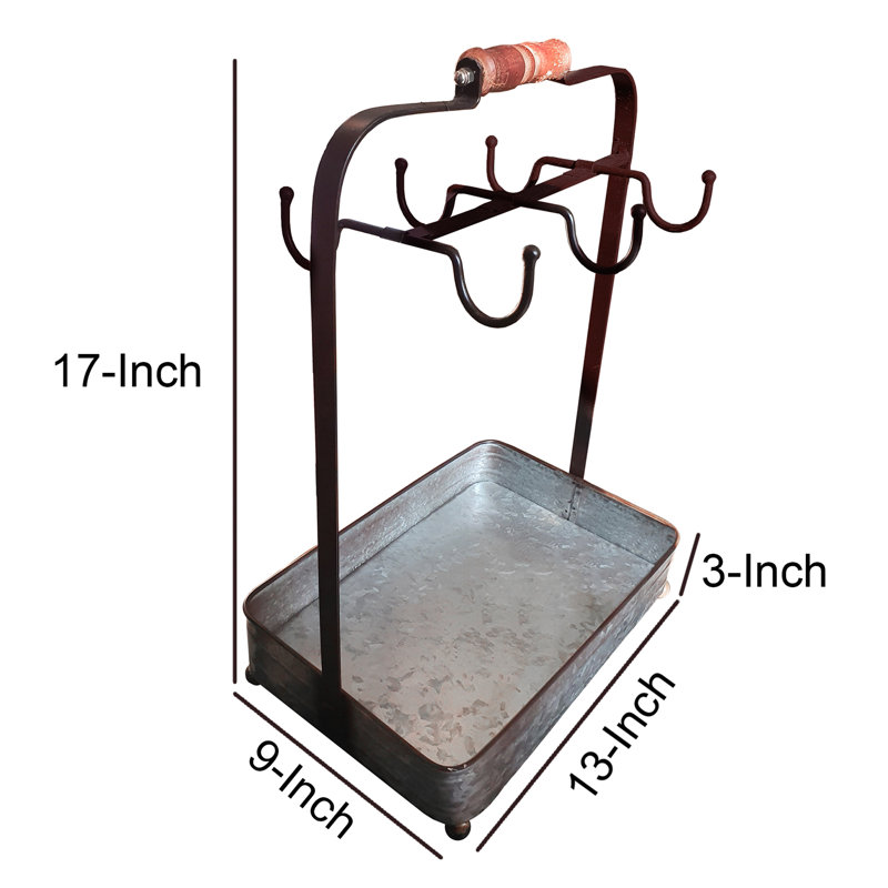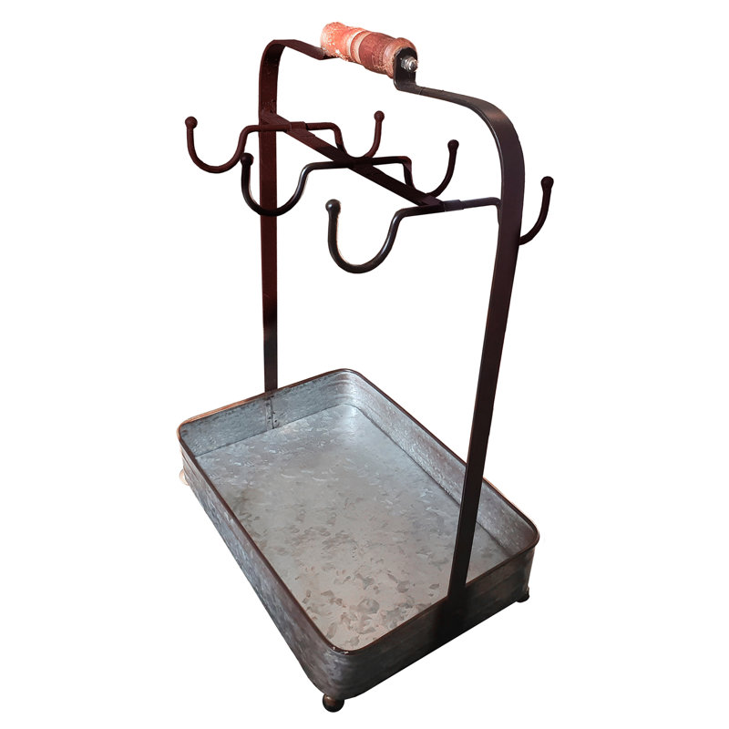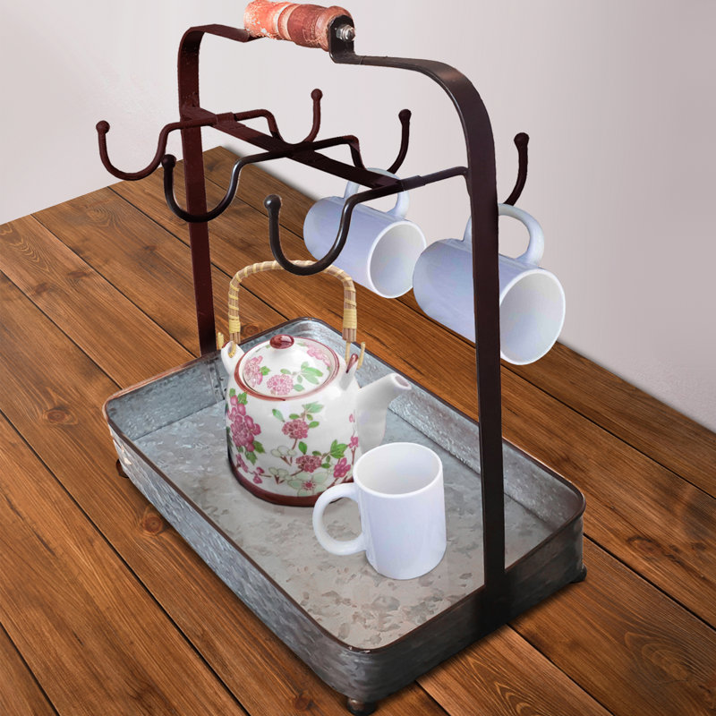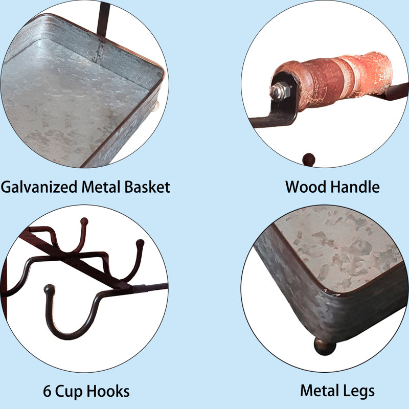 Rustic Style crockery holder, made from galvanized metal sheet, this crockery holder features six symmetrical cup hooks along with attached rectangular basket. With a weight capacity of 4.5 pounds, it makes a great tea time accessory that provides you enough space for holding tea pots, milk, sugar and cups. The handle at the top is made from wood that provides a great portability while moving it from one place to another.