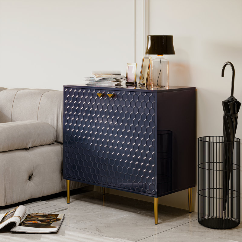 This accent cabinet elevates any room in your home with ample storage and a luxe look. Its stainless steel base supports a solid and engineered wood body crafted with clean, straight lines. The two cabinet doors featured an elegant, raised honeycomb pattern, and they open to reveal an adjustable shelf and versatile space for storing anything from dinnerware to books to shoes. We love the slim legs and triangle knobs in a glam gold tone. Plus, this cabinet has a finished back, so it looks just as good against a hallway wall or in the center of a home office.