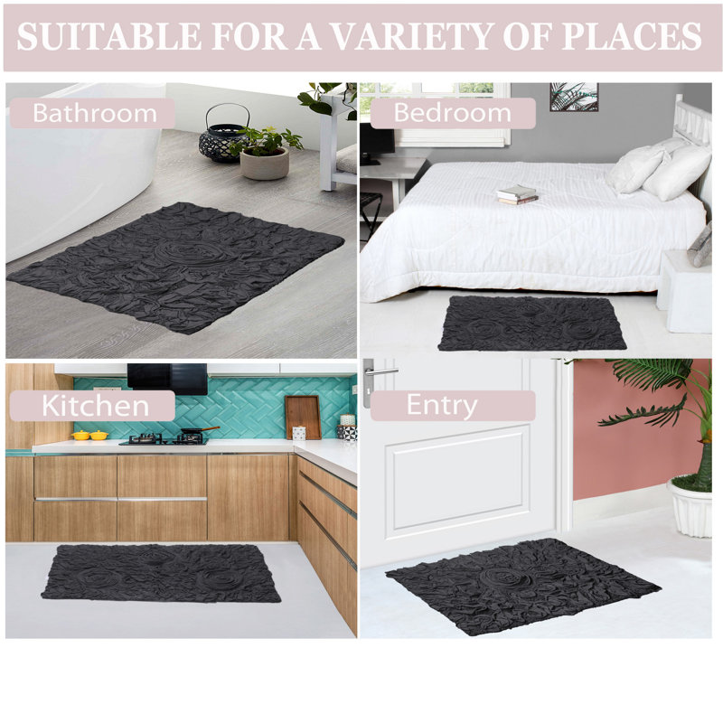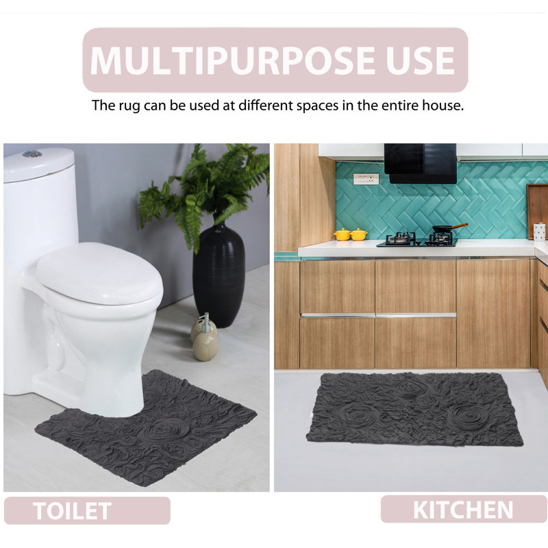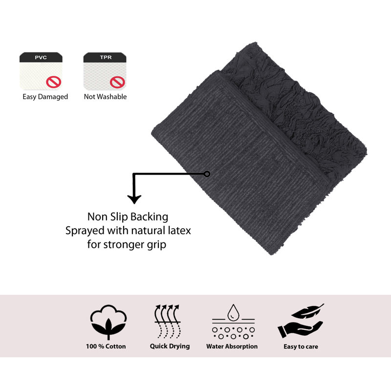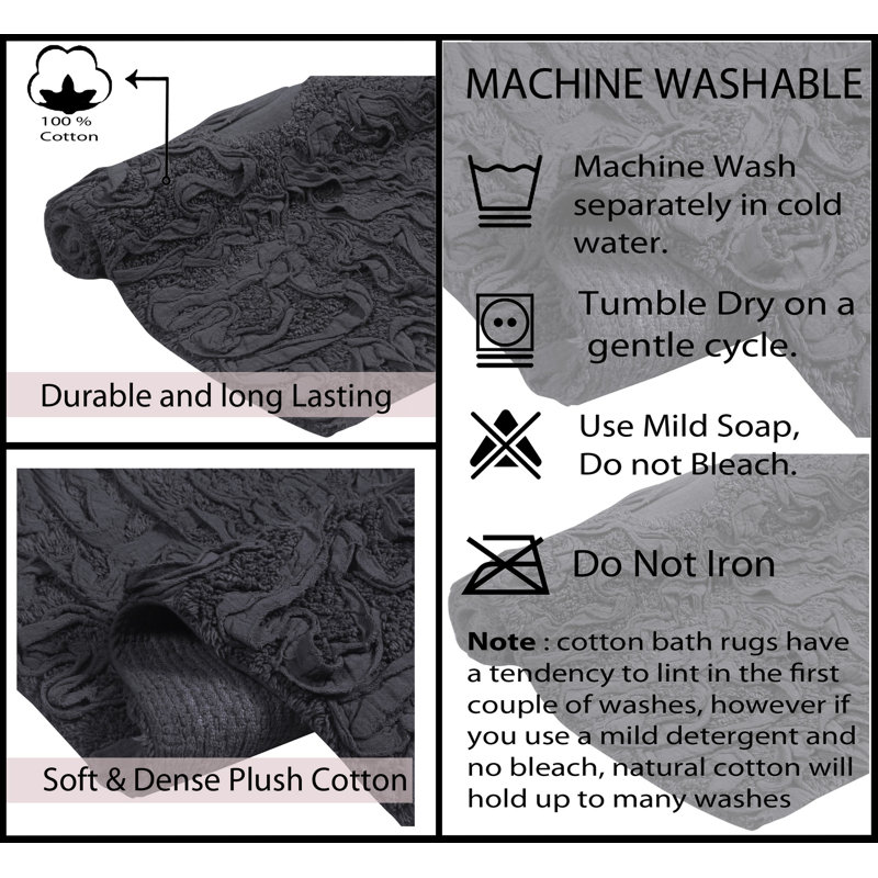 Machine crafted with 100% cotton & Tufted to perfection for ultimate durability, the quality is Built to last for daily use. Heavy Density, Plushness and Pile height of about 0.35â€; makes our bath rug soft, fluffy and relieves pressure & fatigue from your feet and protect them from cold floors. Extra absorbent capacity keeps your bathroom floors (Shower, Sinks, Tubs area) dry. These carpets quickly and efficiently traps and absorbs excess water and moisture.