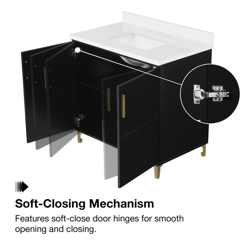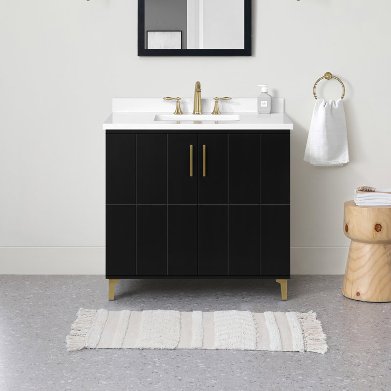 This single 35″ bathroom vanity blends storage and style with a glam touch. Crafted with a clean-lined silhouette, this piece features bracket feet and an engineered marble countertop in a crisp white hue. Wood paneling details two cabinet doors, which open to two interior shelves that offer space to store all your bathroom essentials and toiletries. Sleek metal hardware adds a luminous metallic element and a glam feel. An included backsplash adds a cohesive feel, and its undermount sink comes with pre-drilled holes to add a faucet of your choice (sold separately).