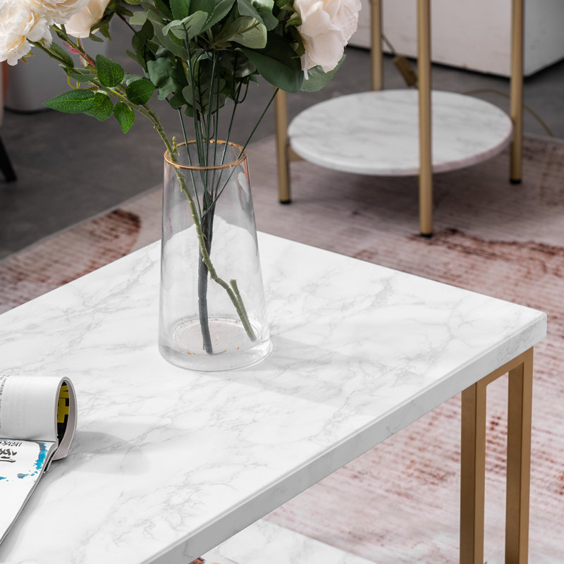 Made of PVC laminated particleboard with powder-coated metal legs, the faux white marble finish pairs with an easy clean. Sturdy metal and composite wood construction designed to last. A durable, laminate faux marble tabletop sits atop the frame designed with a smooth gold finish to add life to any setting.