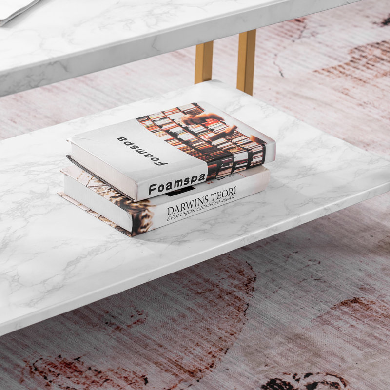 A durable, laminate faux marble tabletop sits atop the frame designed with a smooth gold finish to add life to any setting