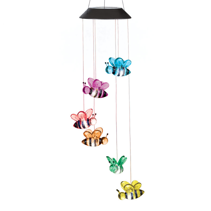You’ll love seeing these beautiful bumblebees sparkling in your yard day and night! The colorful bees dazzle in the sunshine, and automatically shine with solar-powered lights at night. Includes 1 “AA” rechargeable battery as well as hanging chain and hook. Plastic. Approx. 5″Dia. x 27″H with hook and chain.