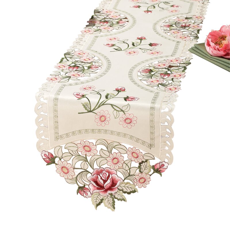 Feature embroidered roses and lacy openwork that combine for a table or dresser that’s pretty and fresh.