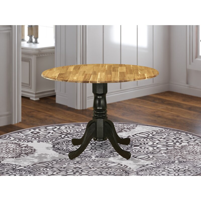 Dining Room Table – Natural Oak Round Table Top and Two Drop Leaves with Wire Brushed Black Pedestal Legs Finish