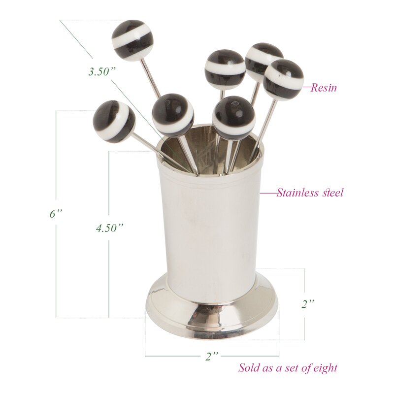 Small details can make a big impression. Show your party guests you’ve thought of everything with this stylish set of eight metal olive picks. Each piece is topped with a black and white ball accent for a tasteful touch of artistry.