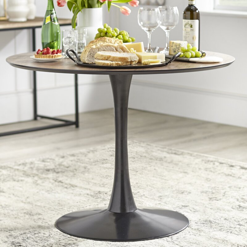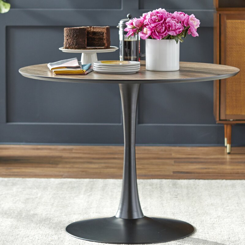 Mid-Century-inspired pedestal table with a black metal base and a Walnut finish wood veneer top