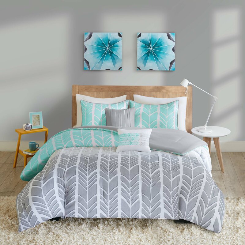 Add a fun and colorful look to your bedroom with the wrought studioâ„¢ Angelli comforter set. The soft microfiber comforter and shams (1 in twin/twin xl) feature a vivid geometric chevron print with a solid reverse, for a bright and spirited look. A square and an oblong decorative pillow provide the textural finishing touch to pull the whole comforter set together. This bedding set is Oeko-Tex Certified, meaning it does not contain any harmful substances or chemicals and uses an antimicrobial treatment that provides built-in freshness protection, reducing the growth of odor-causing bacteria to keep fabric lasting longer.