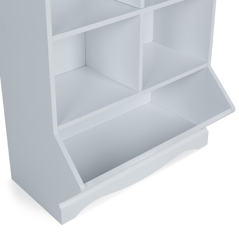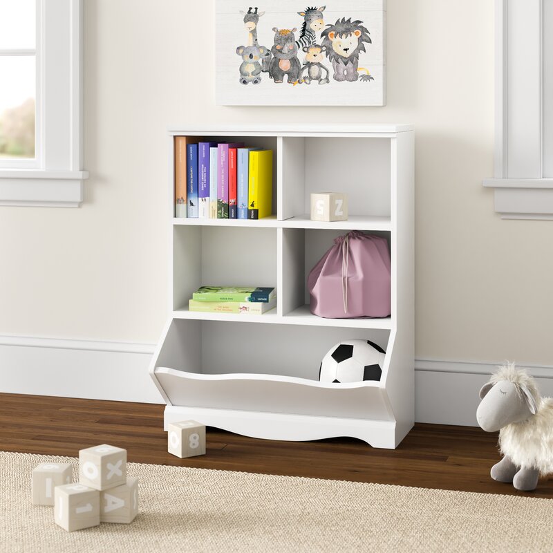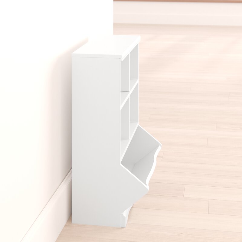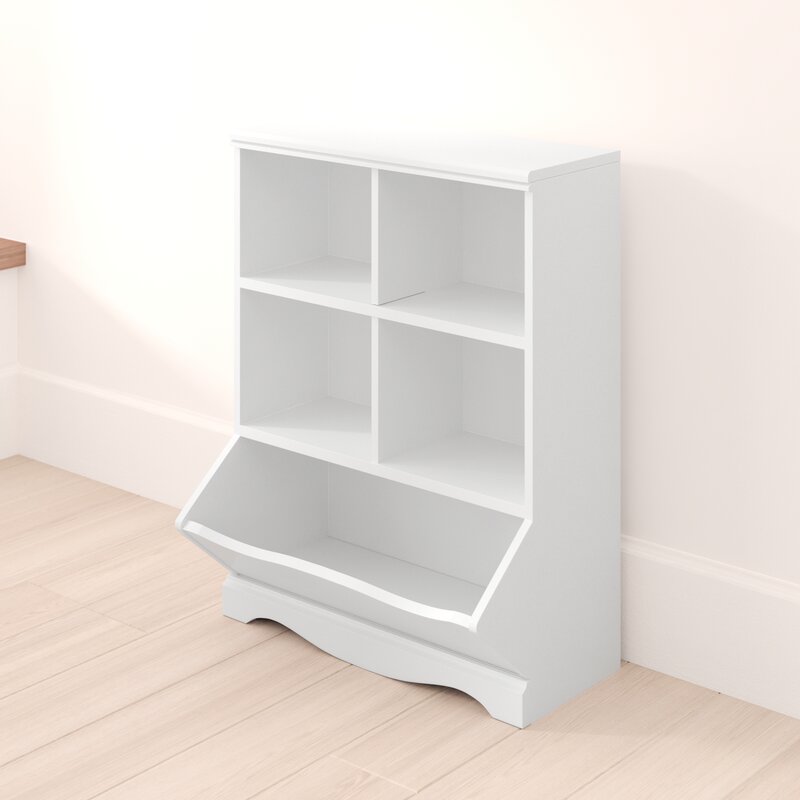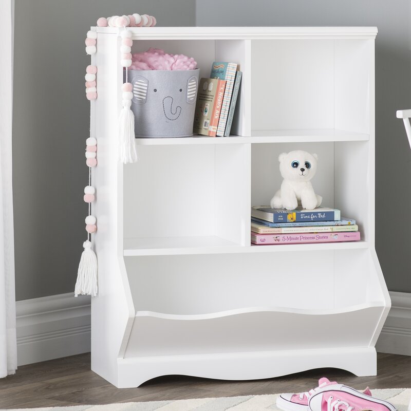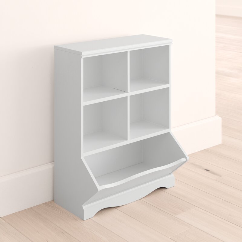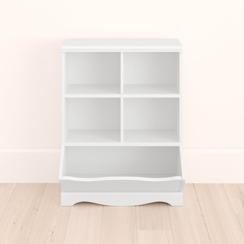 Keep the nursery free from clutter with this cube unit bookcase! Crafted from engineered wood in a clean white gloss finish, this bookcase features simple moldings, smooth side panels, and a scalloped apron that offer a classic look and feel. Four cubbies offer plenty of storage space for picture books and framed photos, while an angled, open bin is great for storing away toys, games, and stuffed animals. Plus, its surface top is great for displaying a wall plaque and other accent pieces.