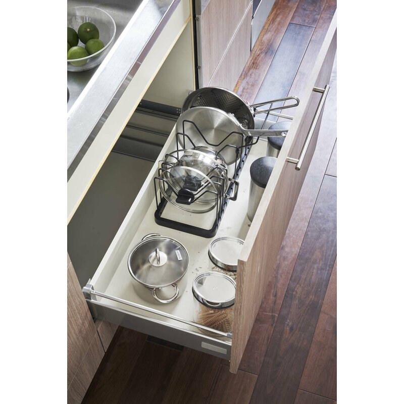 Pan and lid storage, you’ve met your match! This organizer accommodates any size pot lid or pan that your kitchen can throw at it. Expand as necessary and set the support frames to be as close or as far apart as needed. An extra support bar is included to lift panhandles.