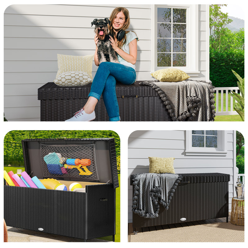 This 200-gallon large deck box can blend into any yard or patio to store furniture cushions, outdoor toys, gardening tools, sports equipment, pool accessories, etc. The top layer doubles as an extra table or bench.
