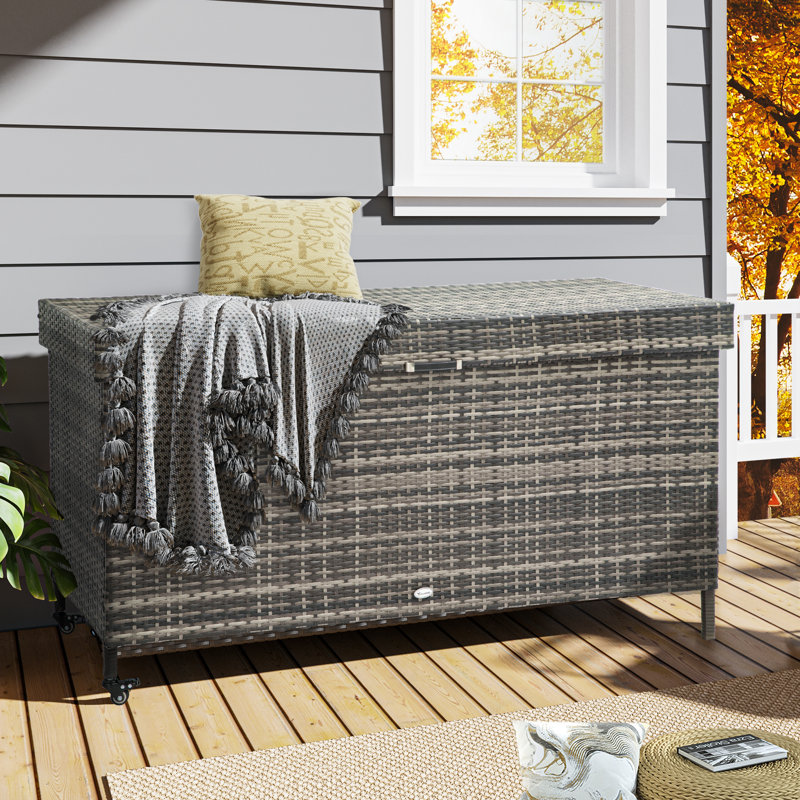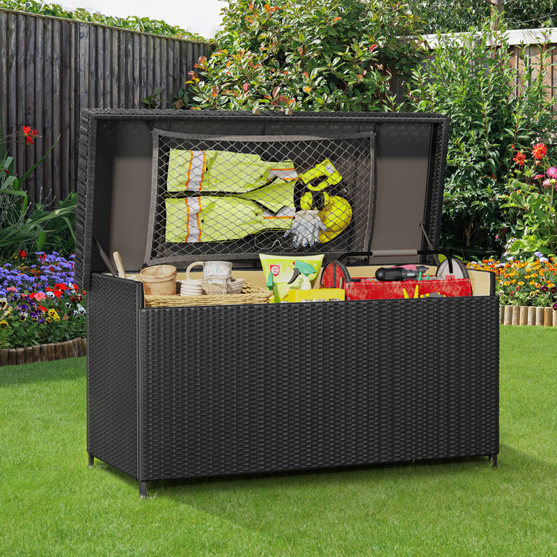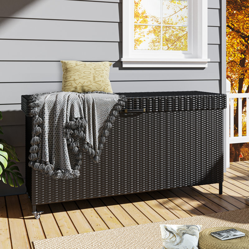 This wicker patio storage box with side handles and 2 have brakes movable wheels are equipped to help you easily move the box anywhere even filled to capacity, such as patio, yards, lawns, poolside, balconies, and so on.