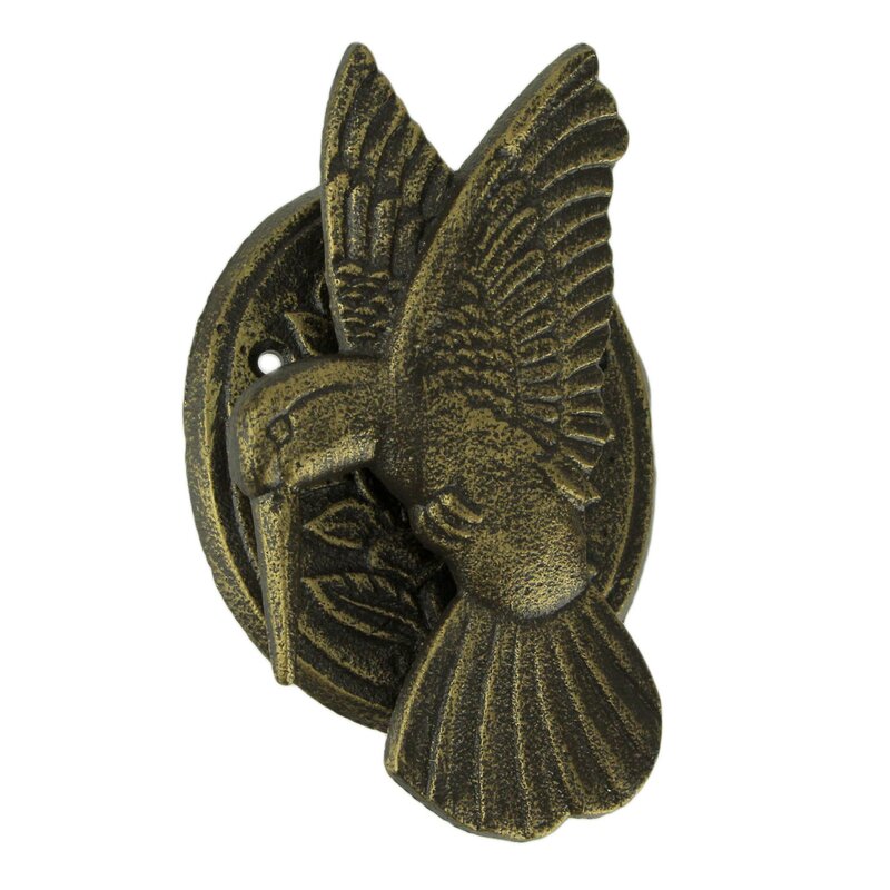 Attach this pretty little bird and flower knocker on your front door and your guests will be chirping with delight. It gives your entry a touch of garden elegance and gives your guests something beautiful to announce their arrival with. Beautifully detailed in durable cast iron. Answer the call of the wildlife with this hummingbird door knocker with 2 pre-drilled mounting holes on the built-in striker plate for quick and easy installation on most wood, metal and fiberglass doors.