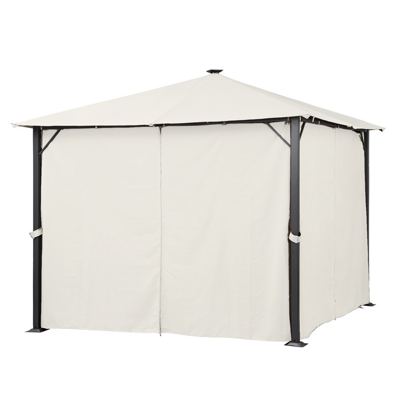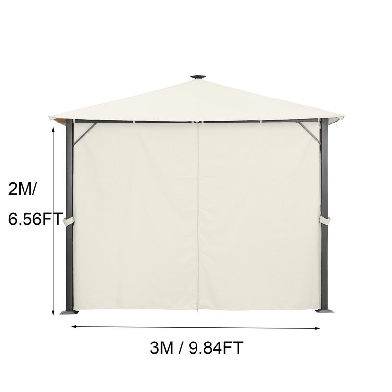 One side of the curtains measures 9.84 ft x 6.56 ft. It fits most of the 10×10 canopy/gazebos on the market. The only thing you need to pay attention to is the height of the item you decided to put on.