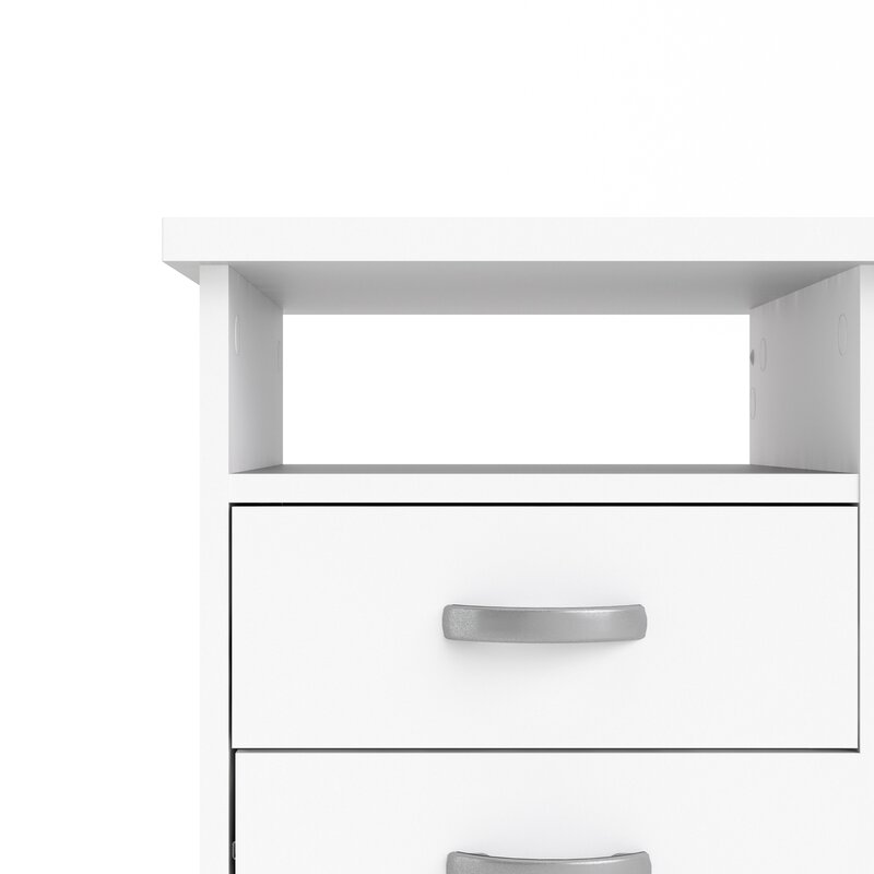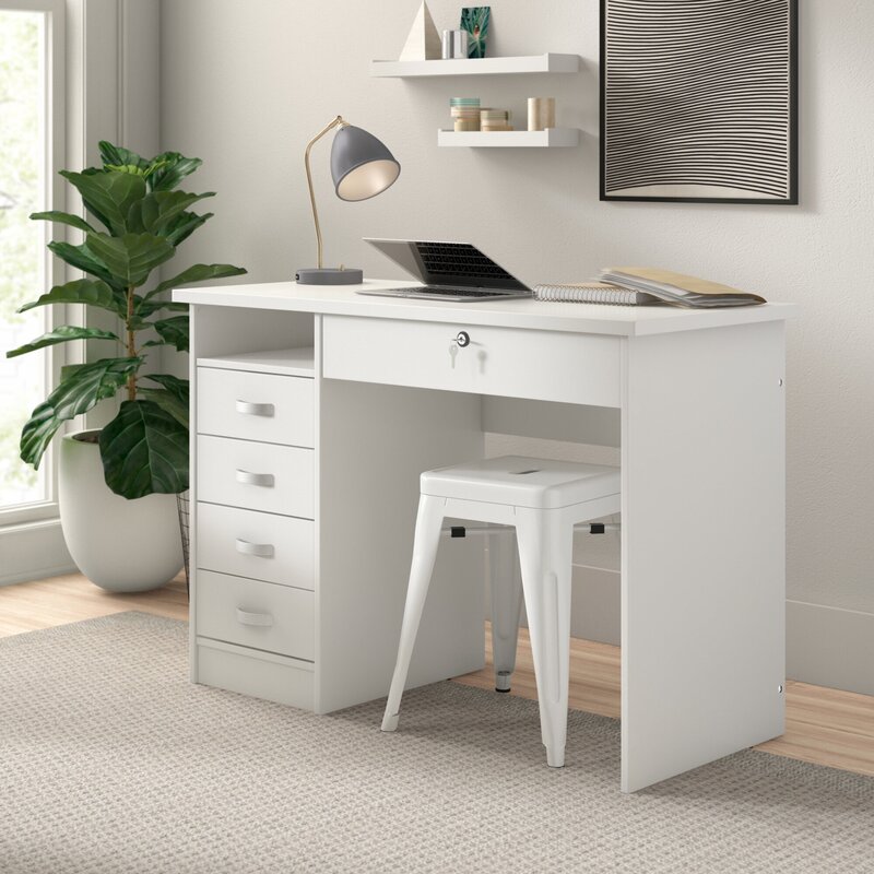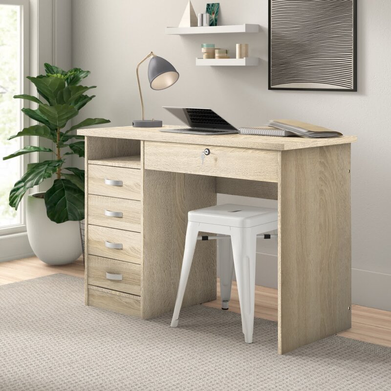 This clean-lined computer desk brings versatile storage and a modern style to your bedroom or dorm room. Crafted with engineered wood, it features a neutral finish that pairs well with transitional aesthetics. A rectangular top rests on a slim support on one side and drawers on the other. Tuck away your textbooks, notebooks, and study materials in the drawers and the open shelf above it, while an additional drawer under the top offers locked storage for important documents. We love that it’s finished back and lets you choose where in your space you put it.
