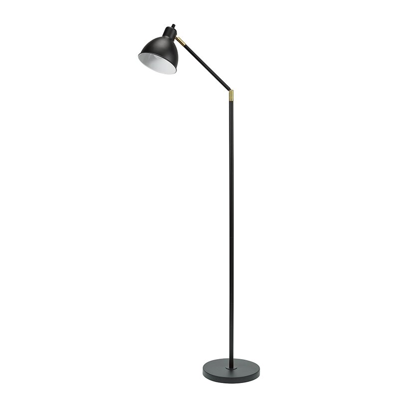 The tall reading floor lamp features a durable metal body, a modern matte black finish, and shiny antique brass details.