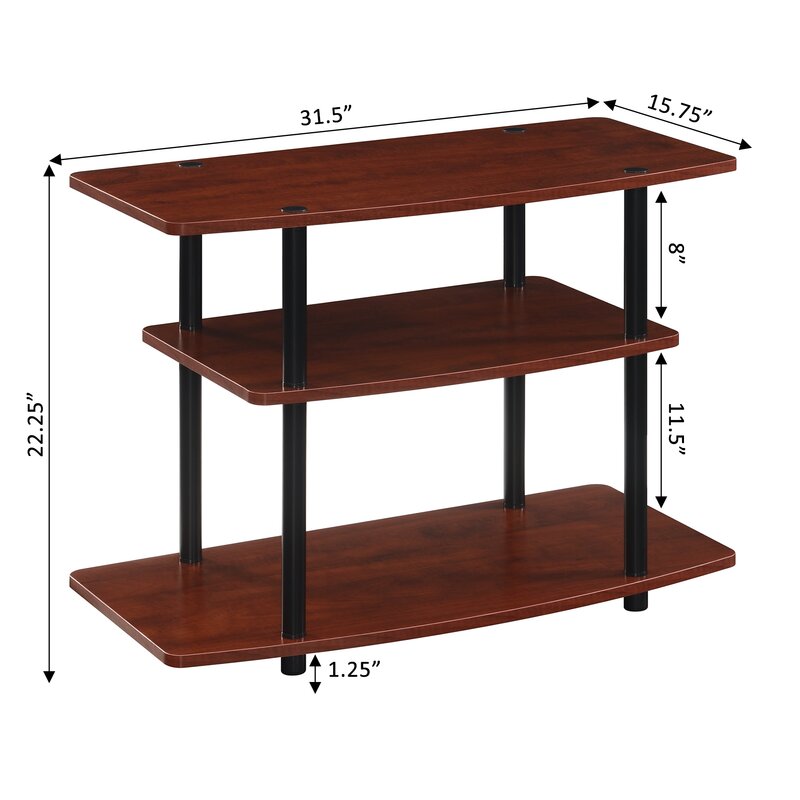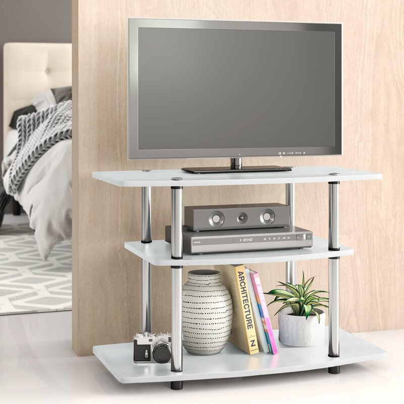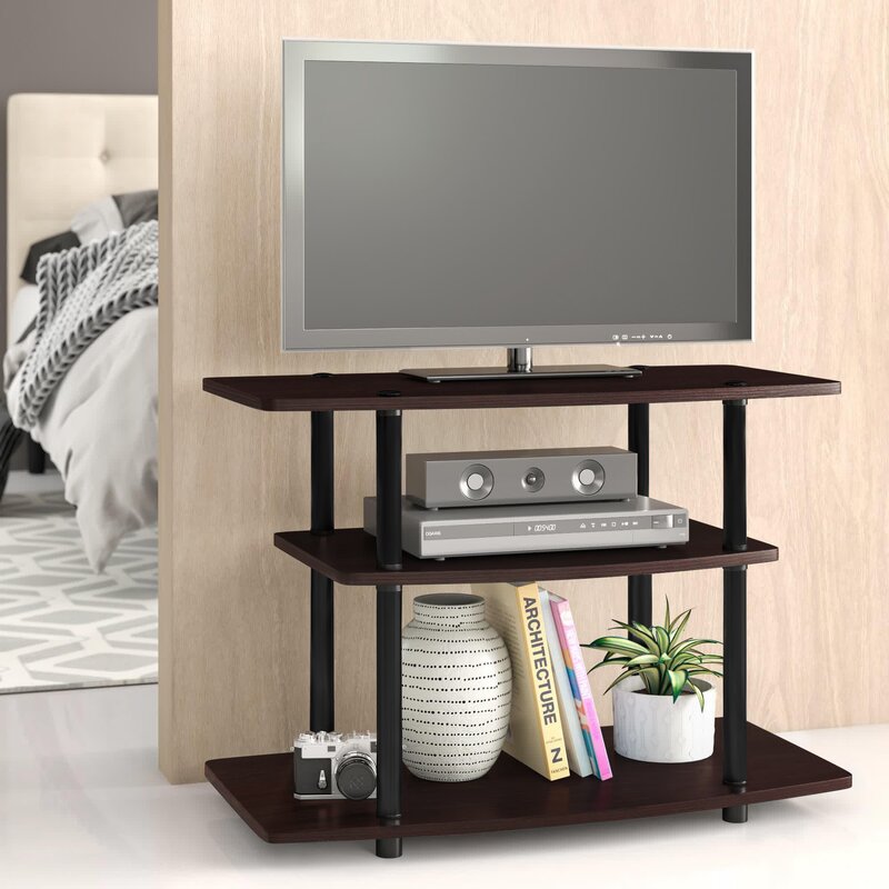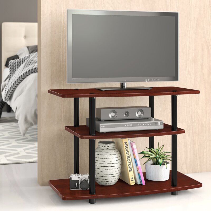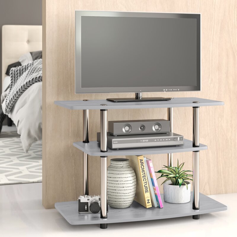 This TV stand features a mix of materials and an open design that anchors your living room or bedroom with a modern look. The shelves are crafted from solid and engineered wood, and they’re held up by sleek stainless steel poles with a shiny finish. We love that its three exterior shelves are ideal for displaying your cable box, decorative items, framed photos, and books. Black plastic caps on the bottom of the poles prevent scuffs and scrapes on your floors. Plus, this TV stand measures 31.5″ wide by 22″ tall, so it’s just right for small spaces.
