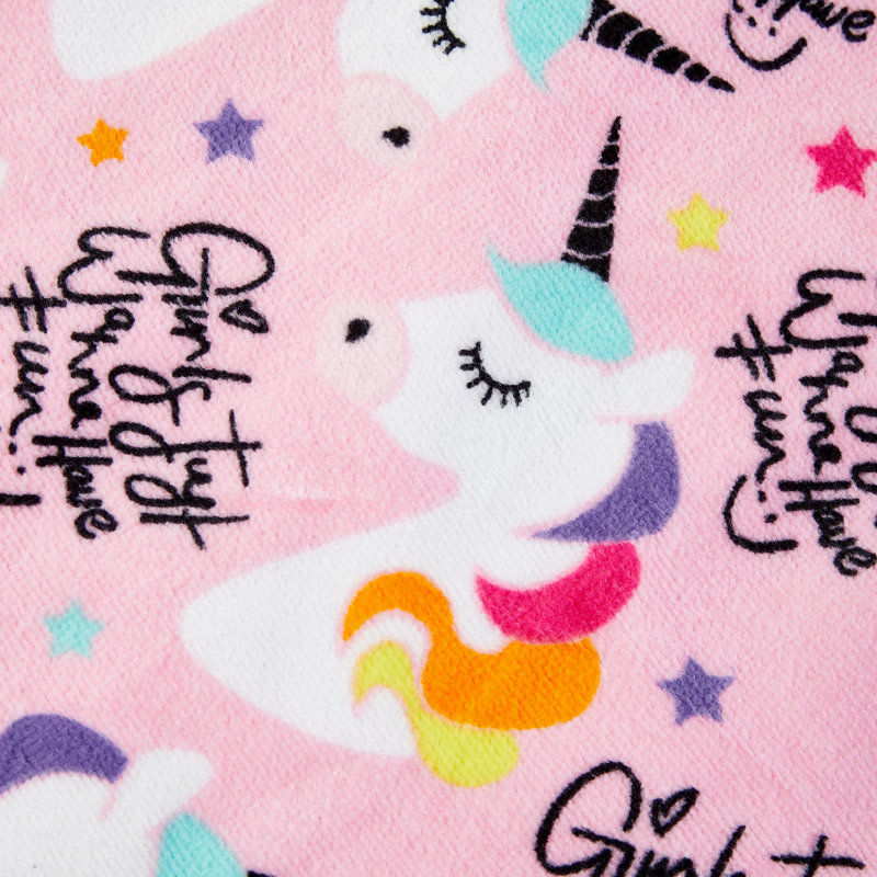Product Specification: The Flossmoor hooded bathrobe towel is pink in color with a unicorn theme print. It measures 36 x 47 in. and is suitable for machine wash and drying.