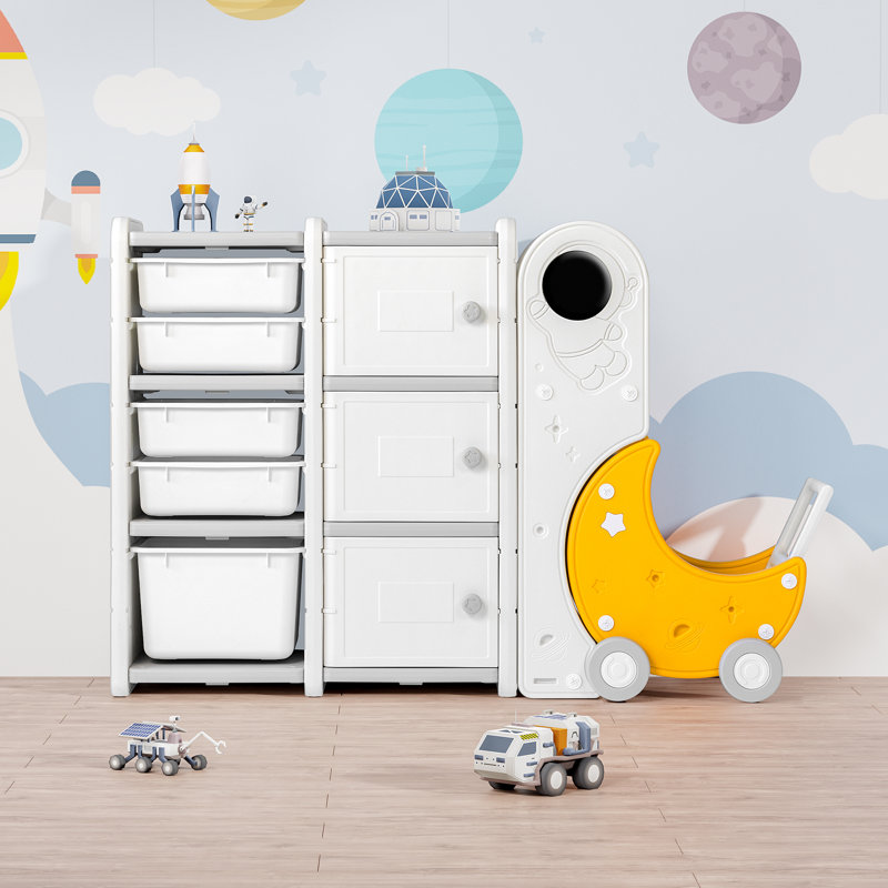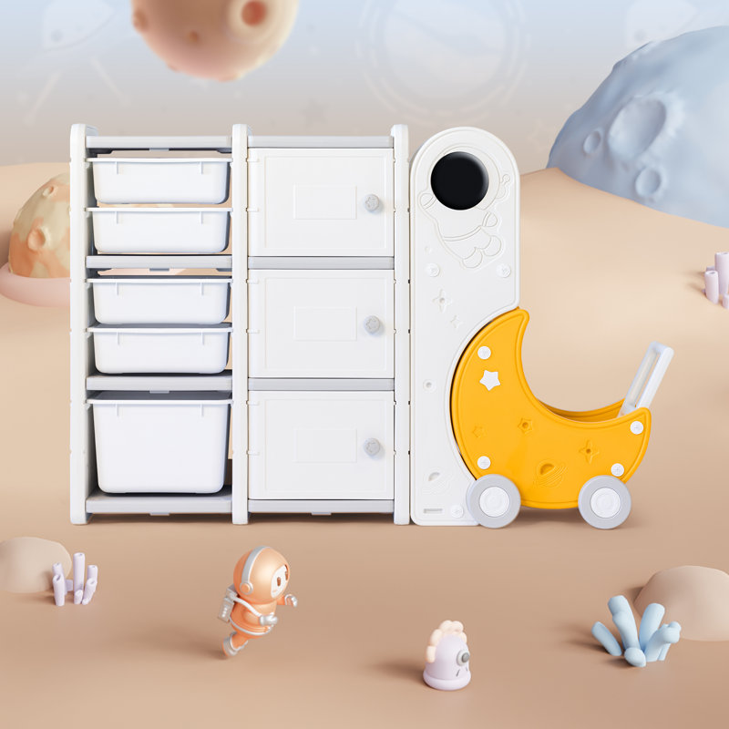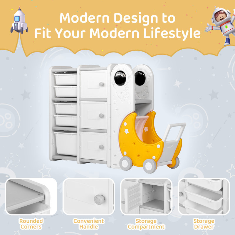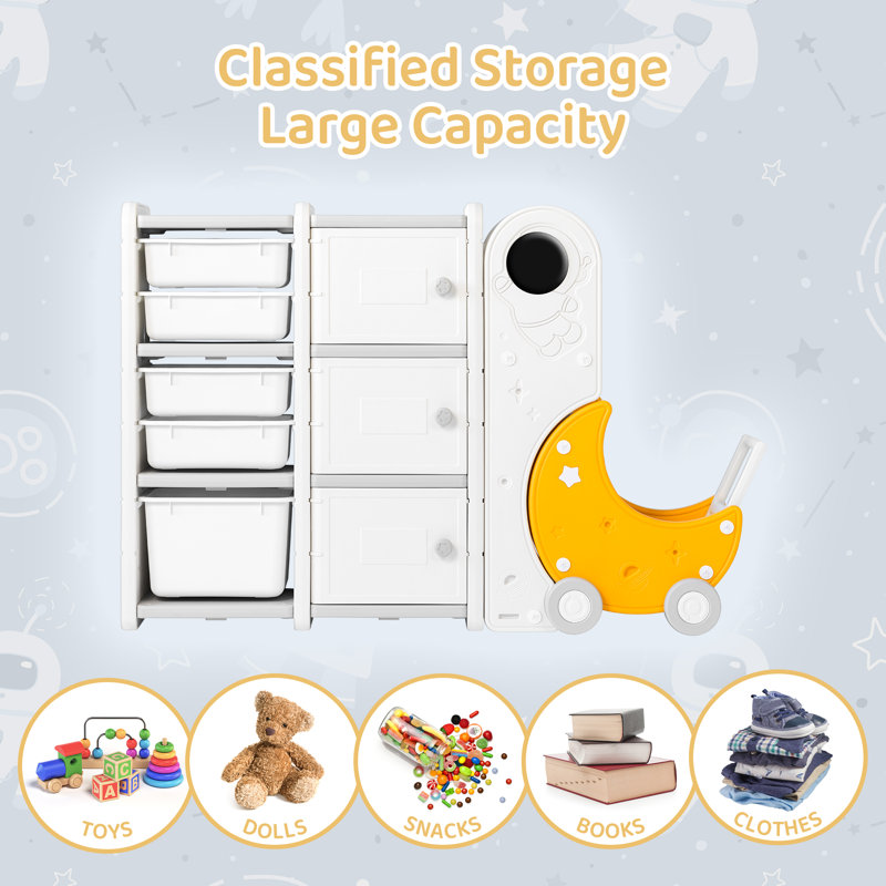 Got too many toys and presents from the holiday season? Don’t worry. Kid’s storage organizer is here to help you collect and organize all the mess. Kids’ 3-layer toy storage organizer comes with 5 pull-out storage bins of two sizes and 3 layers of display shelves and bookshelves. It’s designed in a space theme with a bright yellow-color toy cart that collects your kid’s favorite plush toys and more. The white color is sleek and clean which fits all kinds of homedécor styles. The multipurpose toy cabinets are made of non-toxic thick HDPE materials with a smooth surface and are certified by ASTM and CPSIA. It’s easy to assemble with no extra tools required. Make every clean-up time with your toddlers an enjoyable memory.