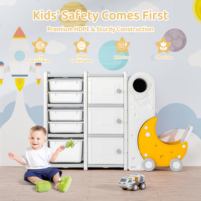 The ASTM-certified toddler toy cabinet is made of non-toxic thick HDPE materials that are BPA-free and odorless