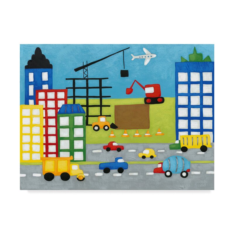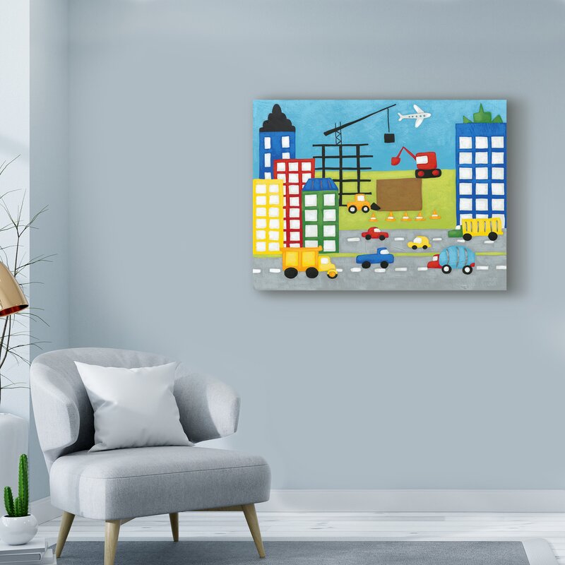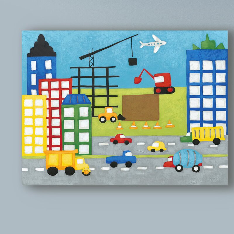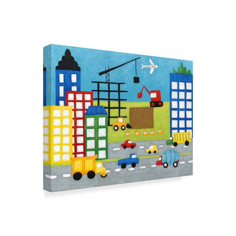This ready to hang, gallery-wrapped art piece features a colorful cityscape with a busy street below