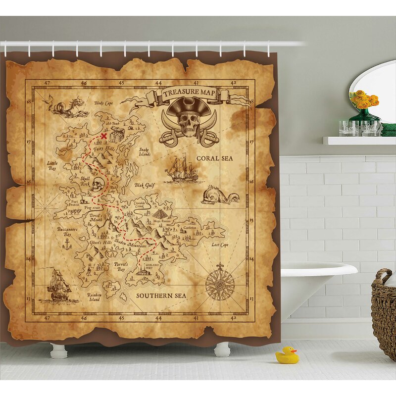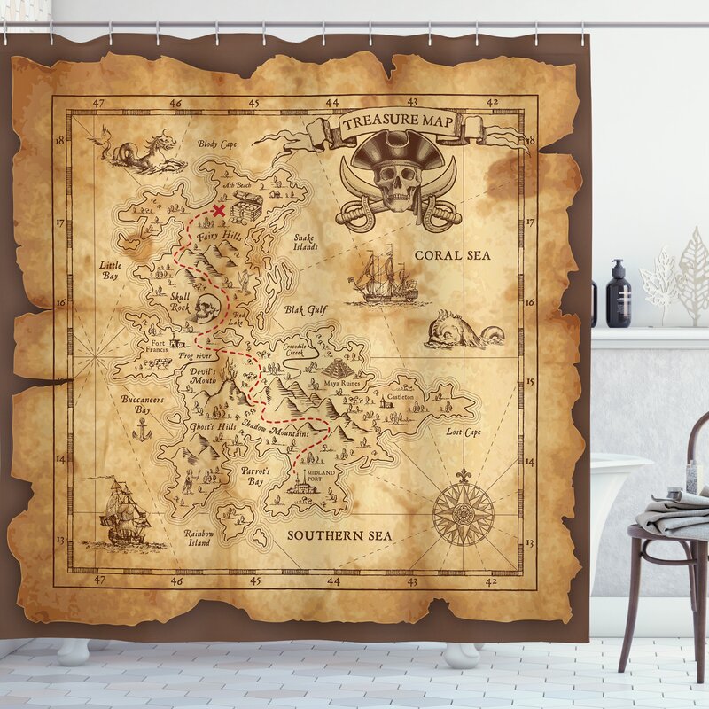 Perfect for a kid’s bath, or a whimsical adult theme. Color and pattern look great, you have to look twice to spot the pirate details – not gaudy at all, just very cool.